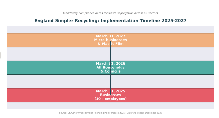 Simpler Recycling rolls out in three phases, and here’s where confusion spreads. The March 31, 2026 household deadline dominates headlines, but businesses actually went first.