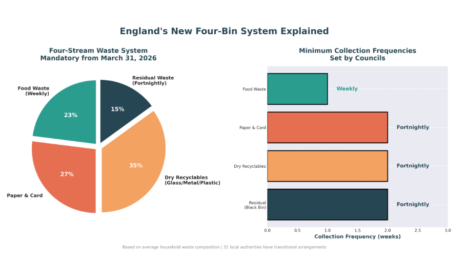 | March 31, 2026 | All households, all local authorities | Four-stream collections, weekly food waste | Councils face legal action from DEFRA; no household penalties |